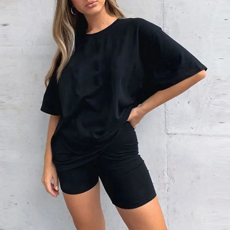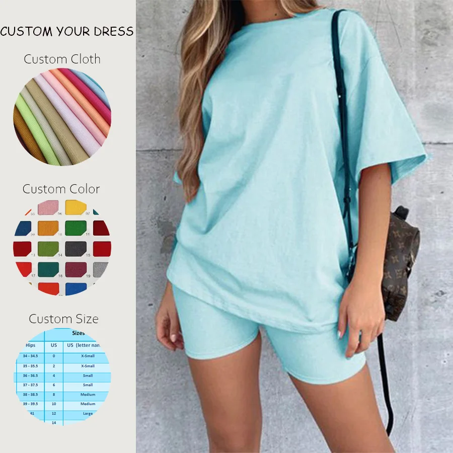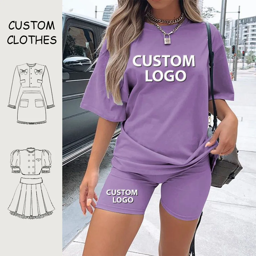 2 Piece OEM Women Custom Logo Outfit Short Sleeve Two Piece Shorts Set Women Casual 100% Cotton Loungewear Female Women Sets